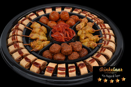 Een mooie grote hapjesschaal met veel saté. Fantastisch op elk feest of gelegenheid.